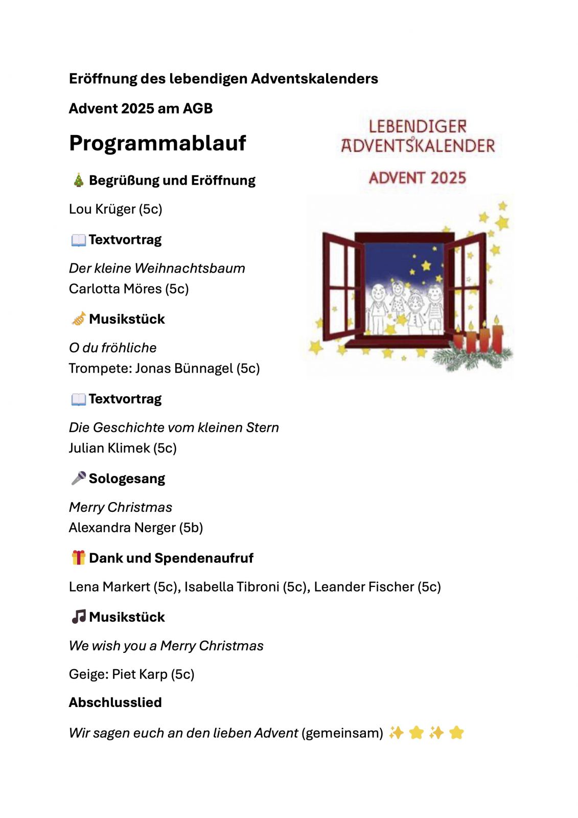Am Dienstag, den 02. Dezember 2025, öffnen wir von 18:00 bis 18:30 Uhr unser lebendiges Adventsfenster, das den Eingangsbereich der Schule in warmes Licht, weihnachtliche Klänge und liebevolle Dekoration taucht.