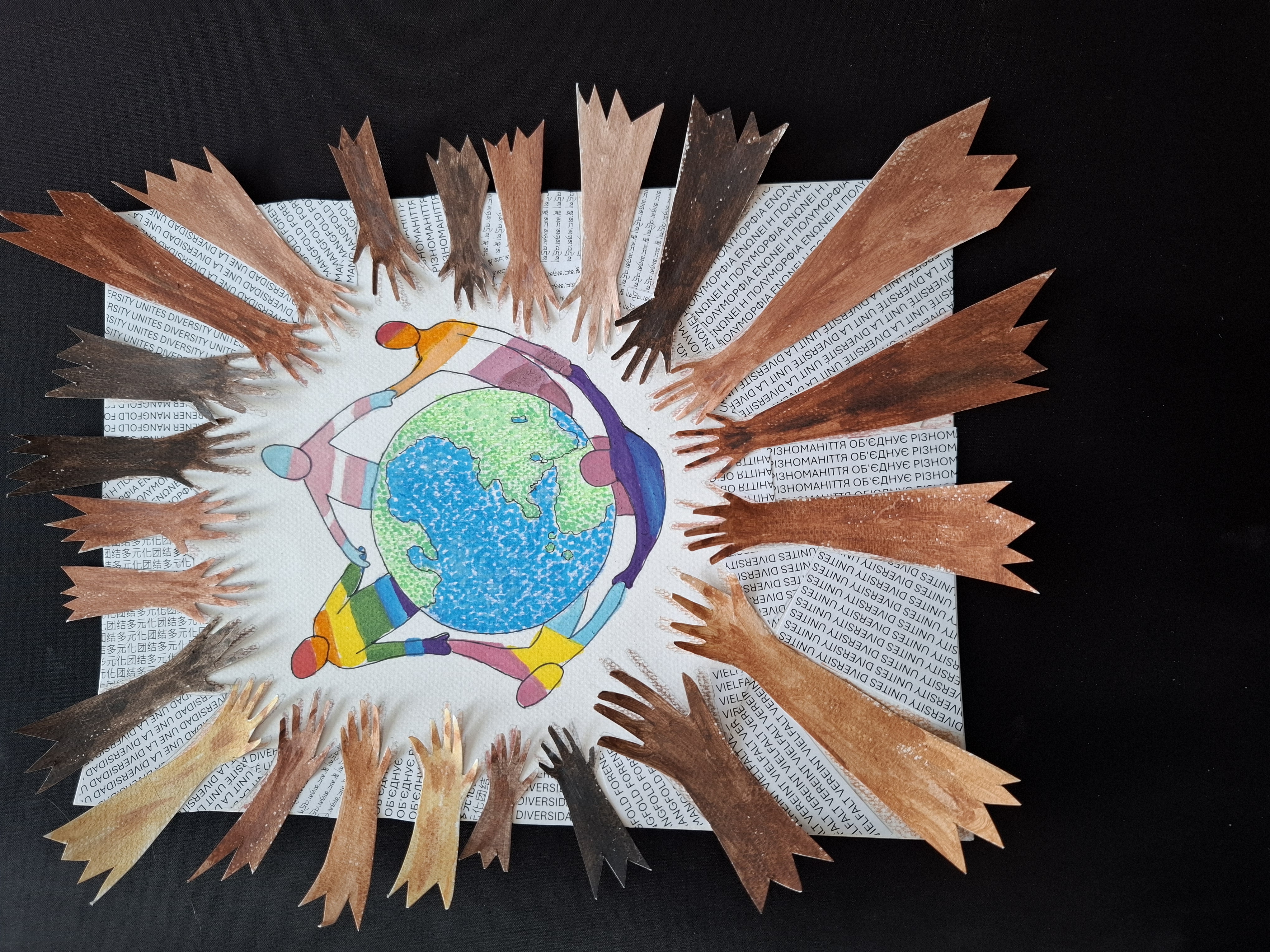 Meine erste Idee (Lili) war es, die Welt als Symbol der Vielfalt darzustellen. Wie diese zusammenhält, zeigte ich durch Menschen in verschiedenen Flaggenfarben, die sich an den Händen halten. Um das Thema weiter zu verdeutlichen, schrieb ich den Satz „Vielfalt vereint“ in verschiedenen Sprachen in den Hintergrund. Abschließend wollte ich die Vielfalt noch einmal durch Hände in verschiedenen Hautfarben betonen, die sich zur Mitte hin zusammenfinden.