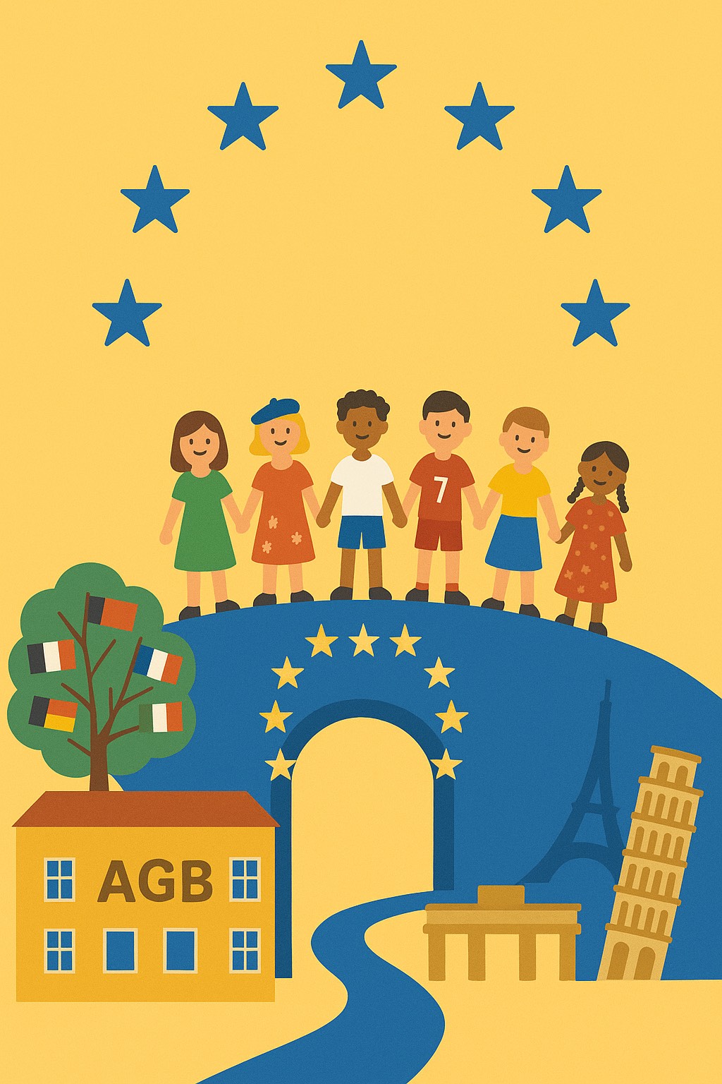 Für mein Kunstwerk (Rochelle) hatte ich die Idee, die Vielfalt der Schülerinnen und Schüler des AGBs durch eine symbolisch gemeinte Brücke in direkter Verbindung zur EU darzustellen. Dafür setzte ich unsere Schule auf die eine Seite und europäische Sehenswürdigkeiten auf die andere. Die Kinder platzierte ich als Symbol der Vielfalt auf der Brücke. Sie repräsentieren die unterschiedlichen Menschen am AGB, während die Brücke die Verbindung zur EU herstellt.