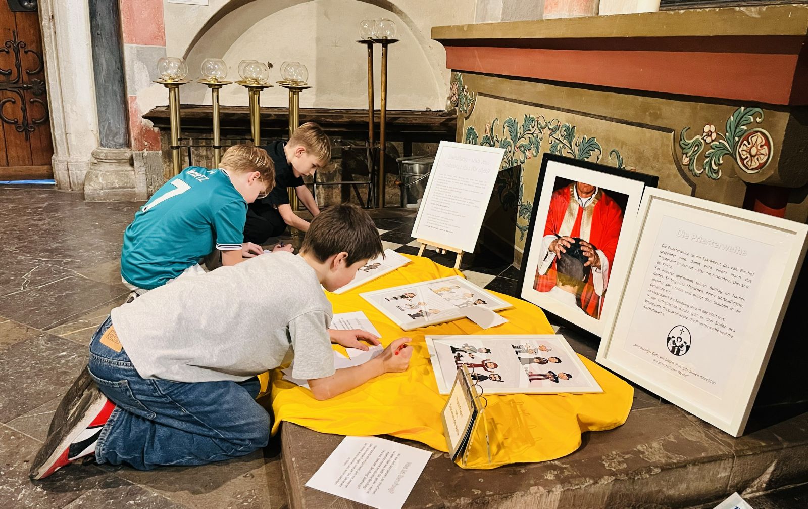 Als wir in der Kirche ankamen, setzten wir uns ins Chorgestühl. Nach einer Begrüßung zeigte uns Frau Zilke die Gemeindereferentin uns Bilderrahmen, in denen Emojis aus dem Alltag abgebildet waren. Wir besprachen diese und klärten ihre Bedeutung.